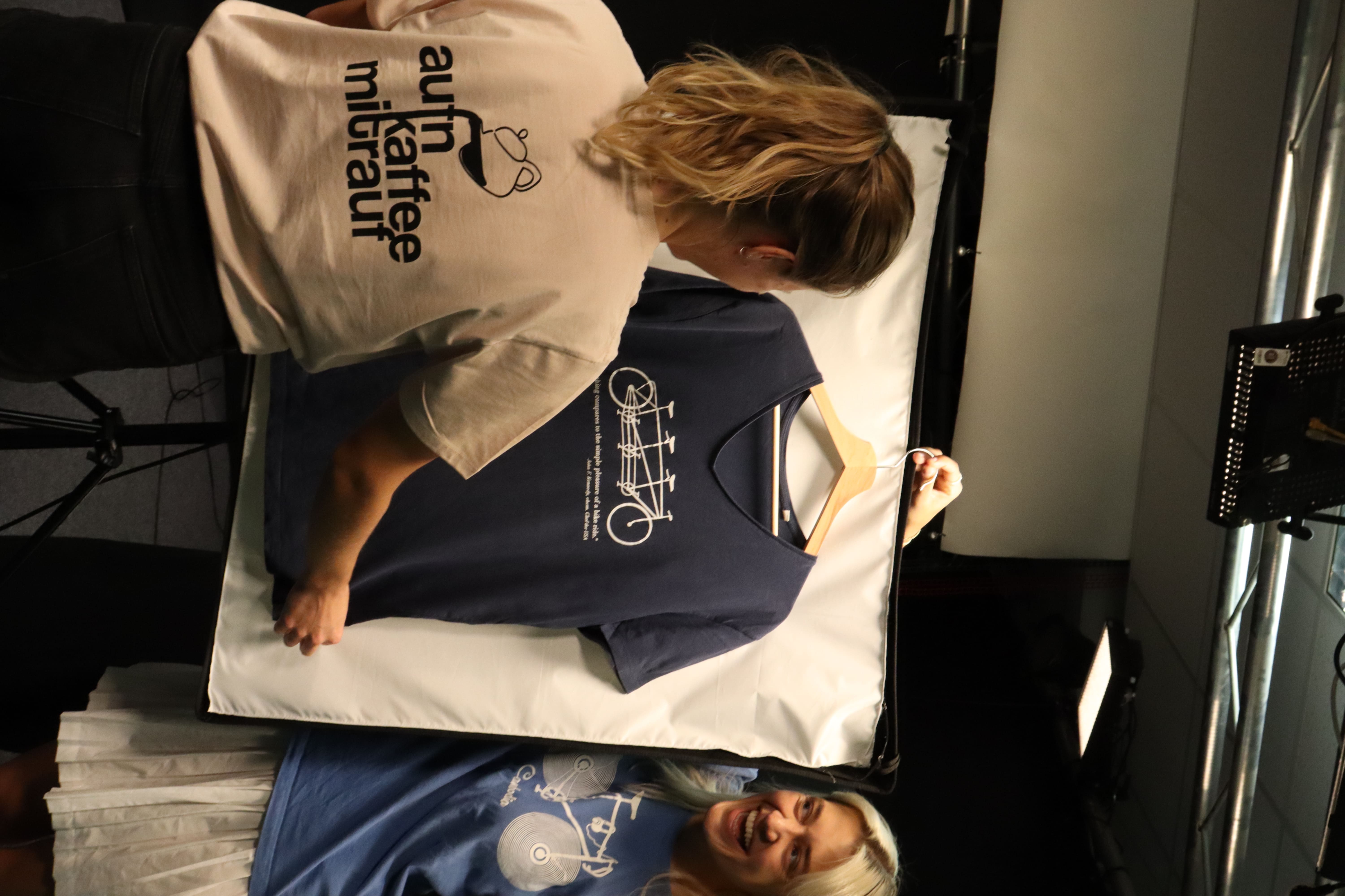 Die nachhaltig und fair hergestellten T-Shirts aus 100% Bio-Baumwolle kaufe ich zu. Anschließend werden diese in Karlsruhe von Hand bedruckt und mit dem kleinen aber feinen Schiffchen versehen.